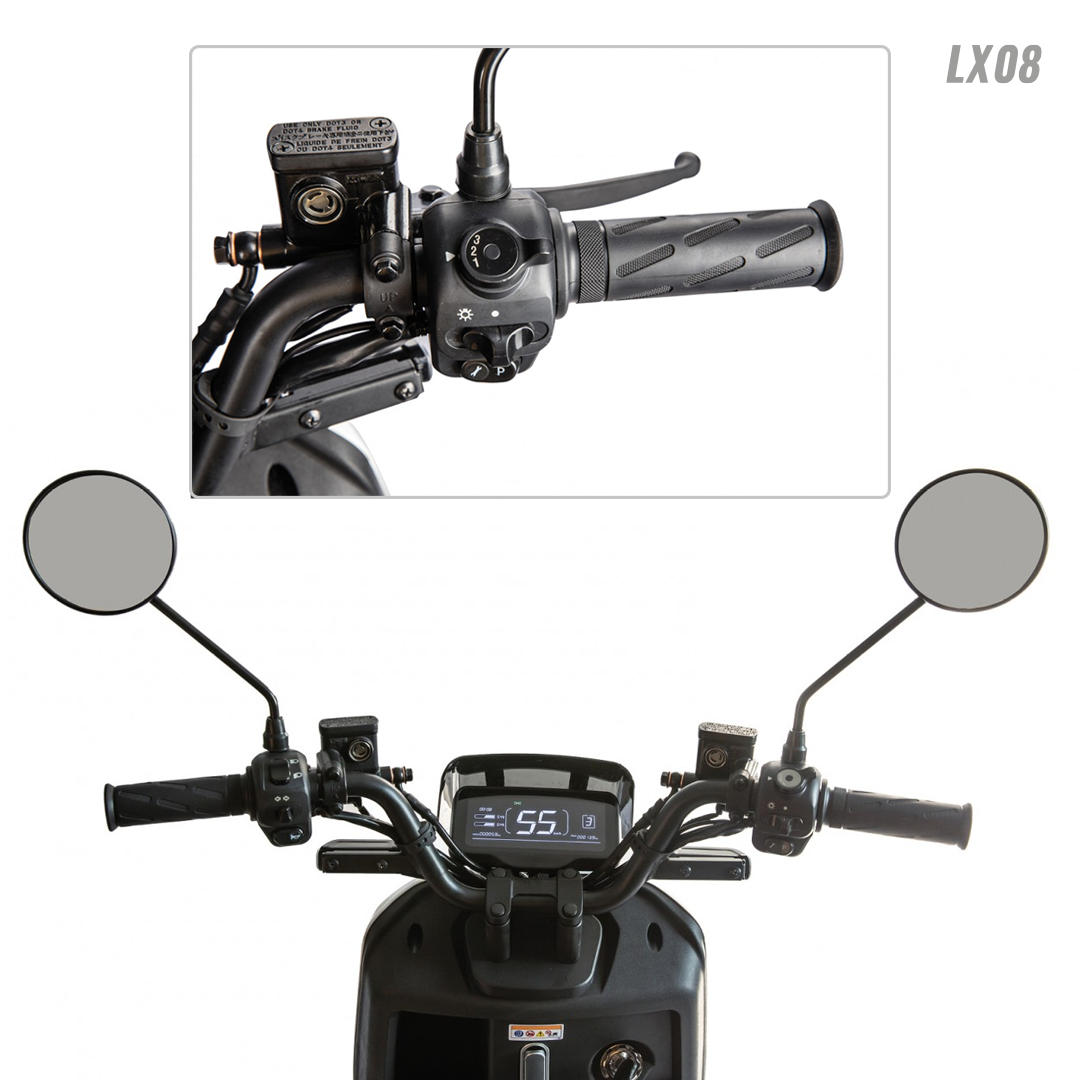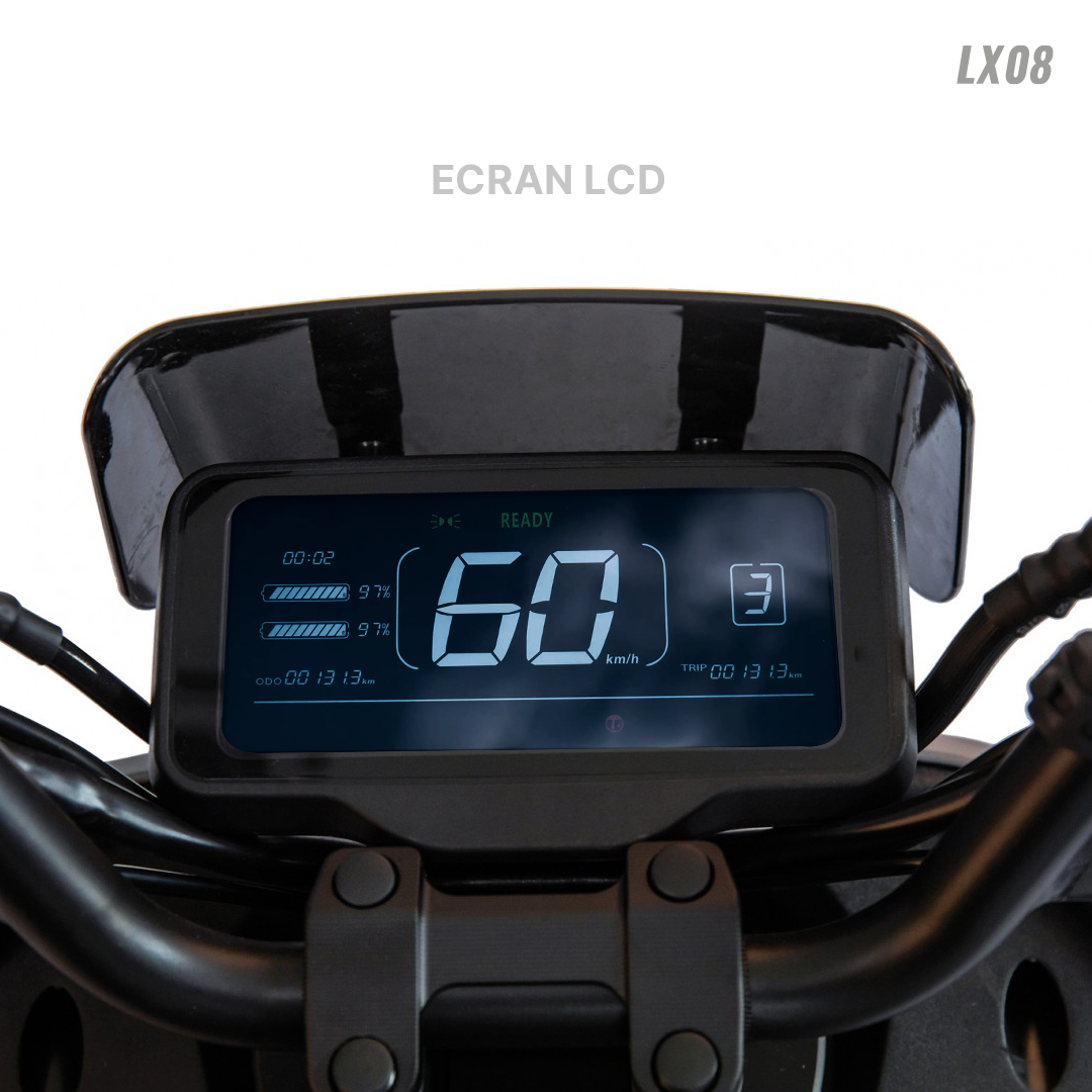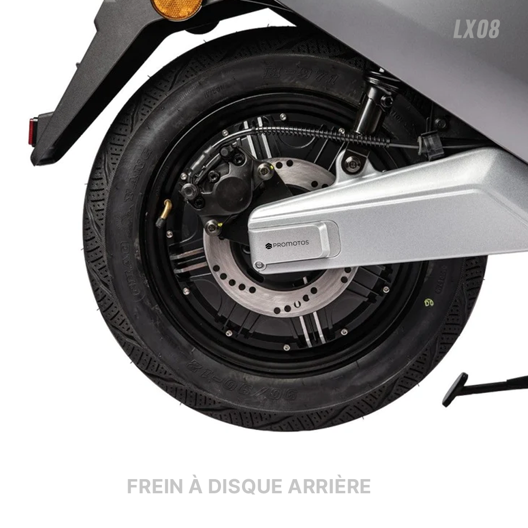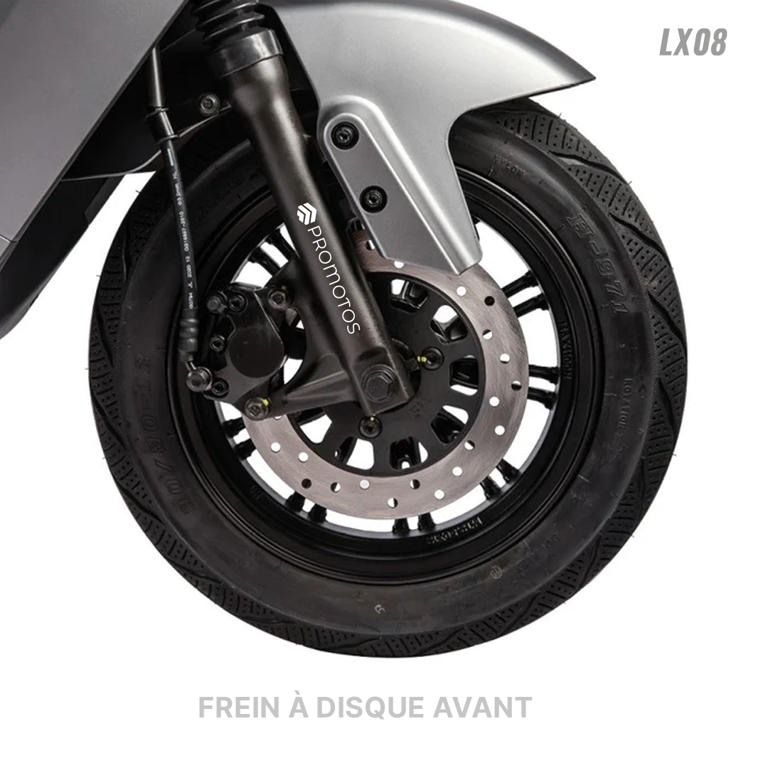 Scooter Électrique LVNENG LX08 - Type de Moteur: Bosch, Puissance de Moteur: 2030 Watts, Vitesse max: 60 km/h, Poids maximum supporté: 255 Kg, Batterie Lithium-ion 60V 23.4 Ah (BMS Système de management de batterie), Temps de recharge: 4 heures (de 0 à 100%), Autonomie de Batterie: Jusqu'à 50 km par batterie, Frein à disque avant & arrière, Pneus Tubeless 90/90/12, Éclairage LED, Capacité de pente: 15° (27%), Étanchéité IPX7, Alarme intégrée, Démarrage sans clé, Mode parking, Port USB, Vide poche, Repose pied rétractable, Télécommande, Sans Haut-Parleurs et Connexion Bluetooth, Dimensions: 1895 x 700 x 1180 mm, Garantie: 2 ans (sur Batterie) + 25000 Km (sur Moteur)