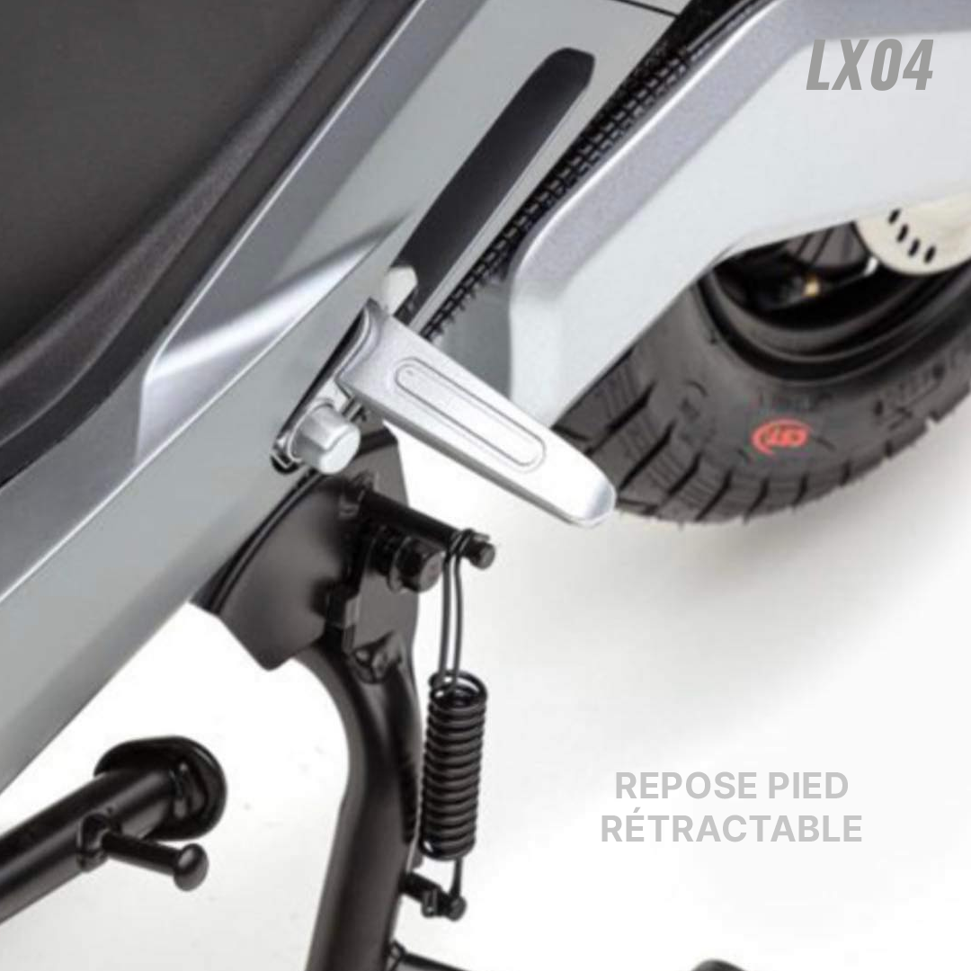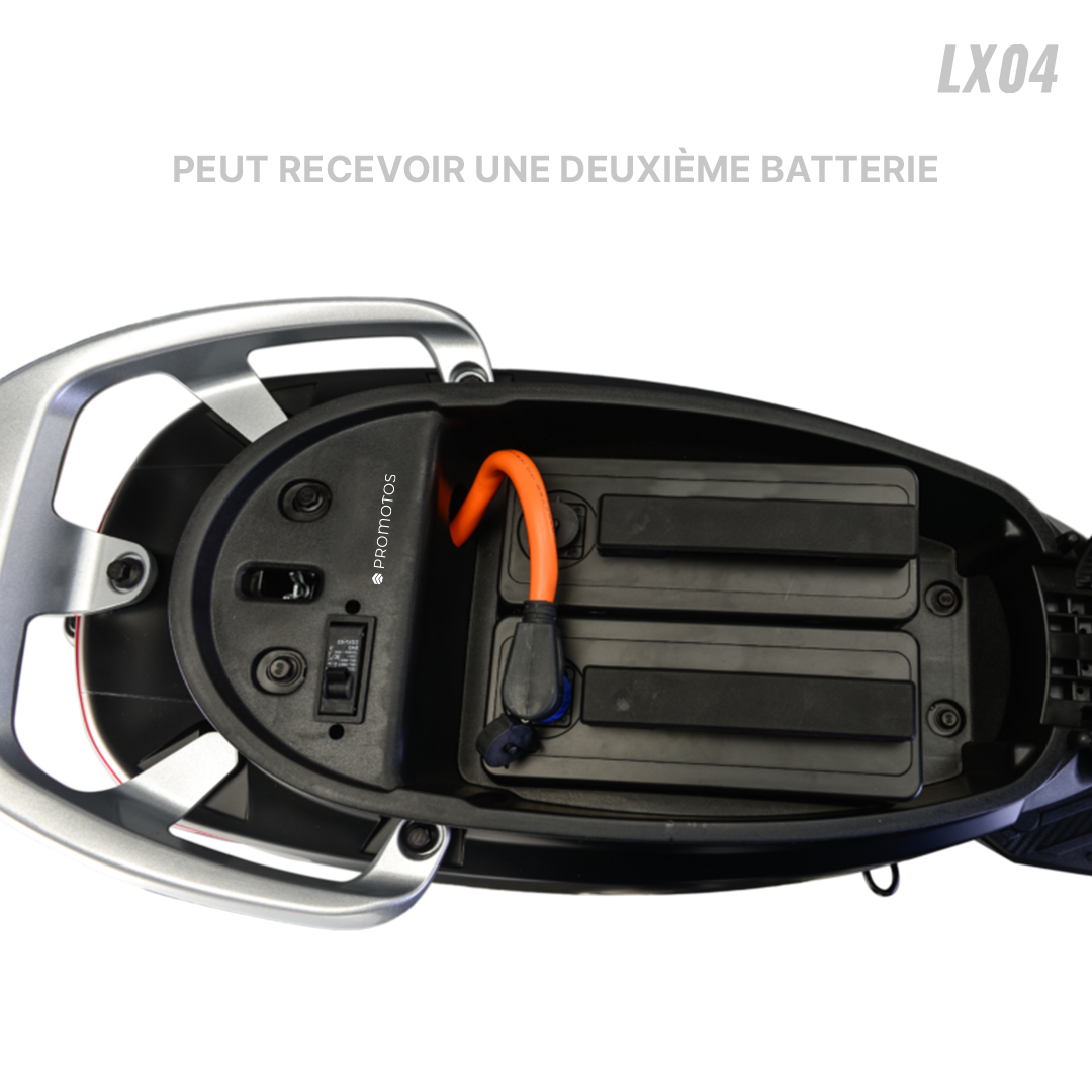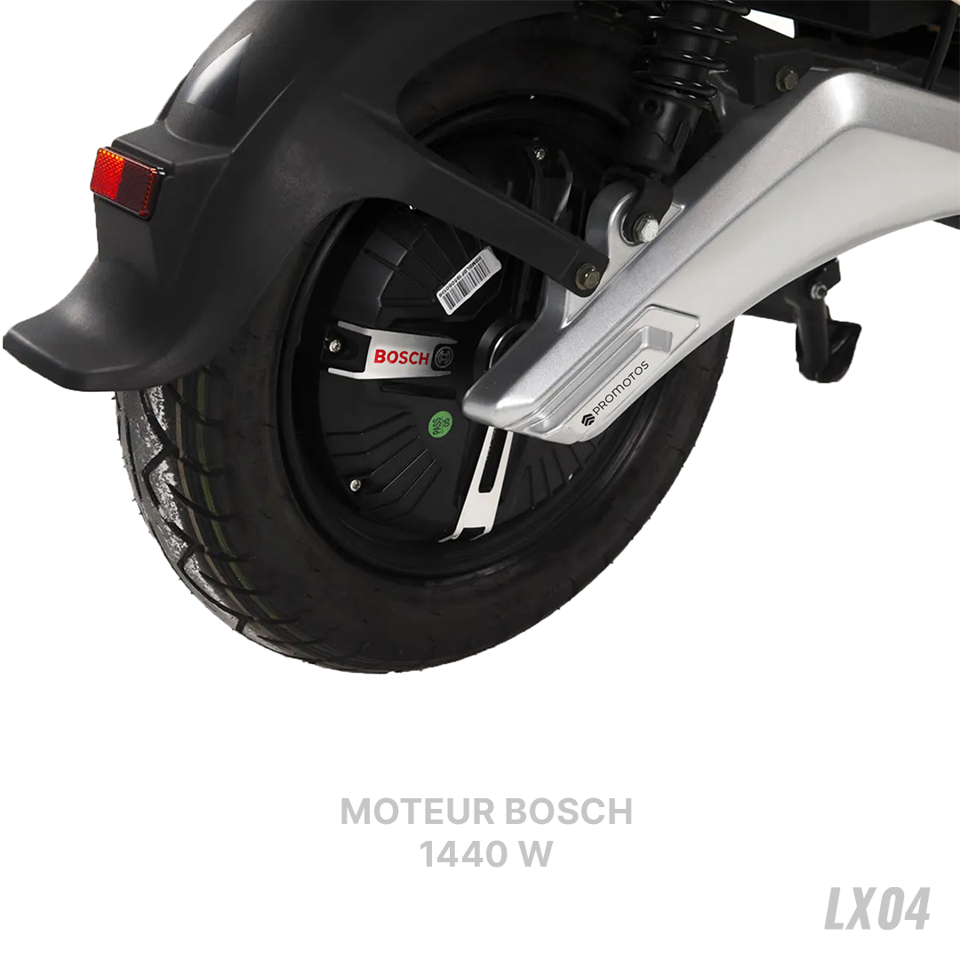 Scooter Électrique LVNENG LX04 - Type de Moteur: Bosch, Puissance de Moteur: 1440 Watts, Vitesse max: 45 km/h, Poids maximum supporté: 217 Kg, Batterie Lithium-ion 48V 26 Ah (BMS Système de management de batterie), Temps de recharge: 4 heures (de 0 à 100%), Autonomie de Batterie: Jusqu'à 50 km par batterie, Frein à disque avant & arrière, Pneus Tubeless 80/100/10, Éclairage LED, Capacité de pente: 12° (21%), Étanchéité IPX7, Alarme intégrée, Démarrage sans clé, Mode parking, Port USB, Vide poche, Repose pied rétractable, Télécommande, Sans Haut-Parleurs et Connexion Bluetooth, Dimensions: 1700 x 700 x 1050 mm, Garantie: 2 ans (sur Batterie) + 25000 Km (sur Moteur)