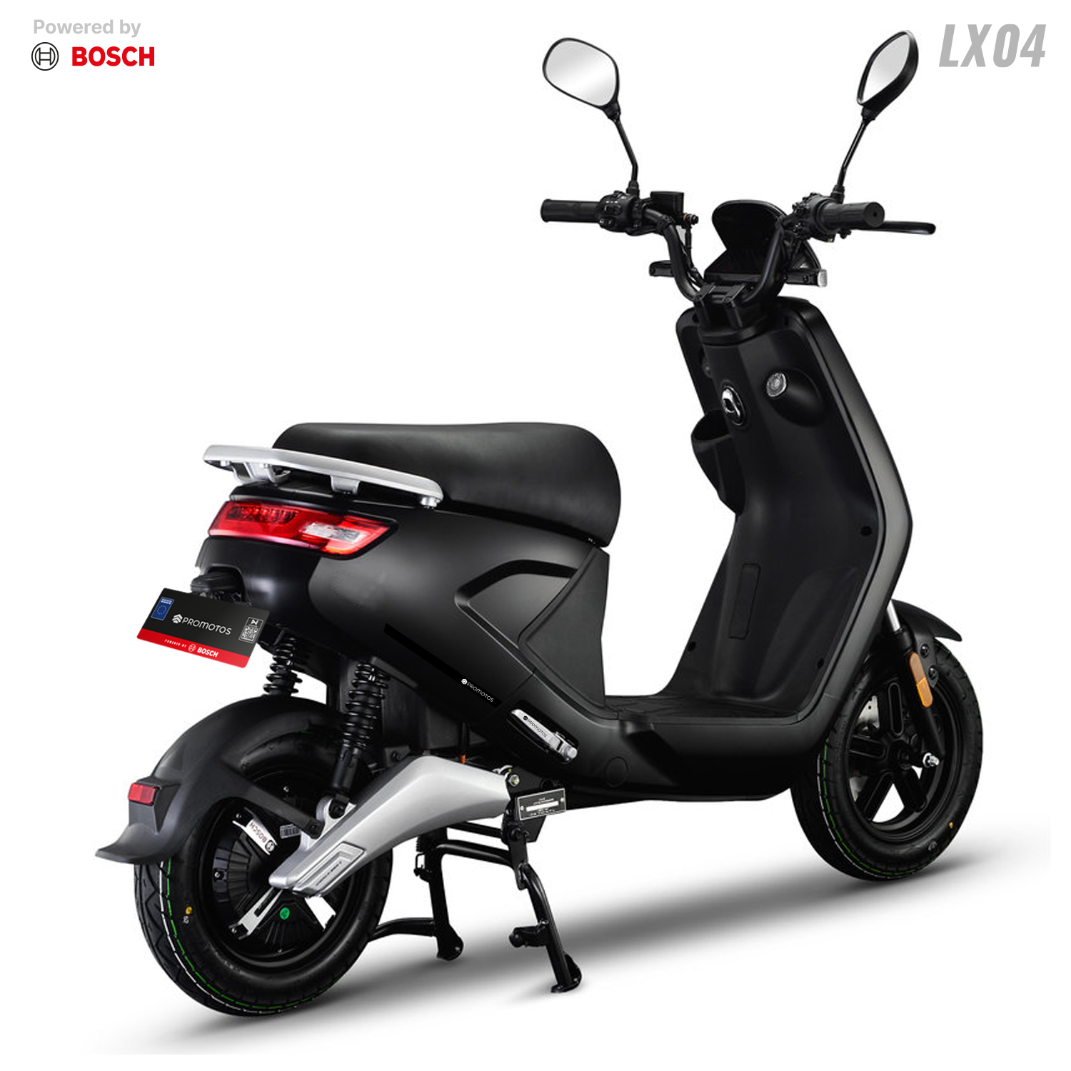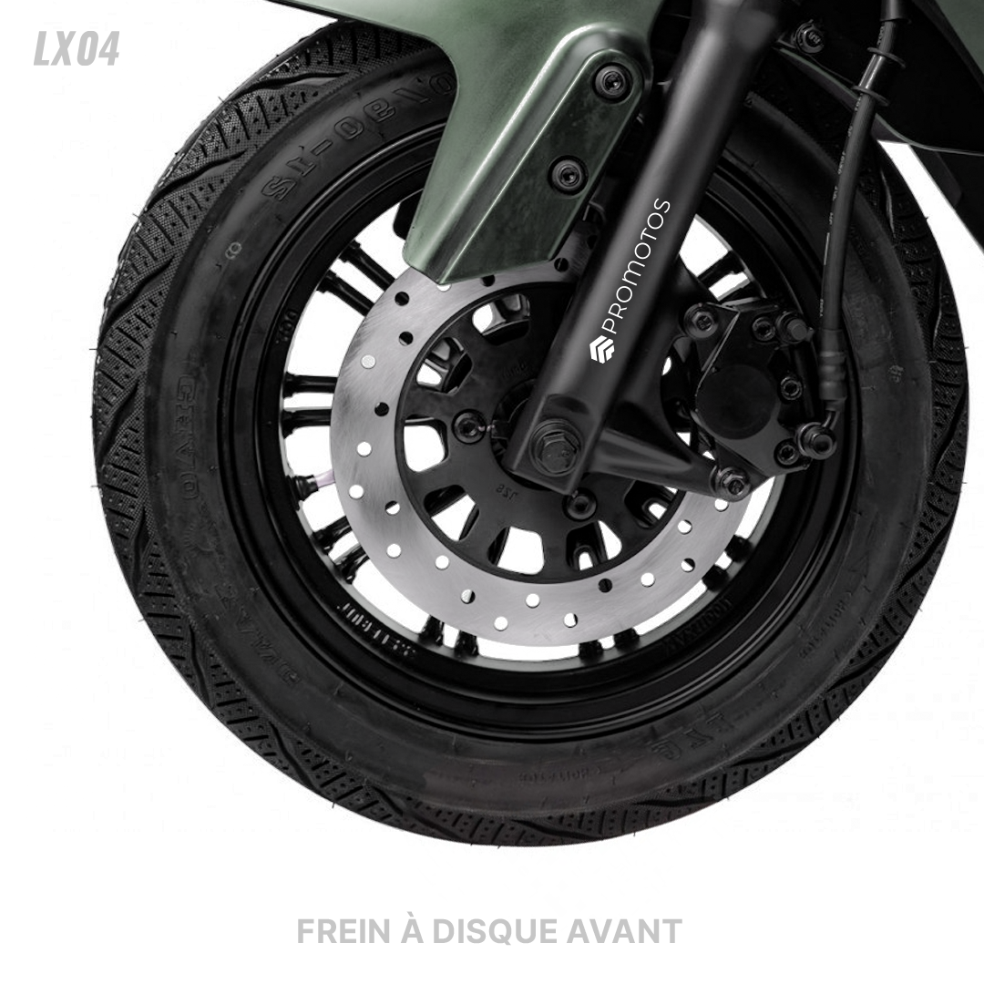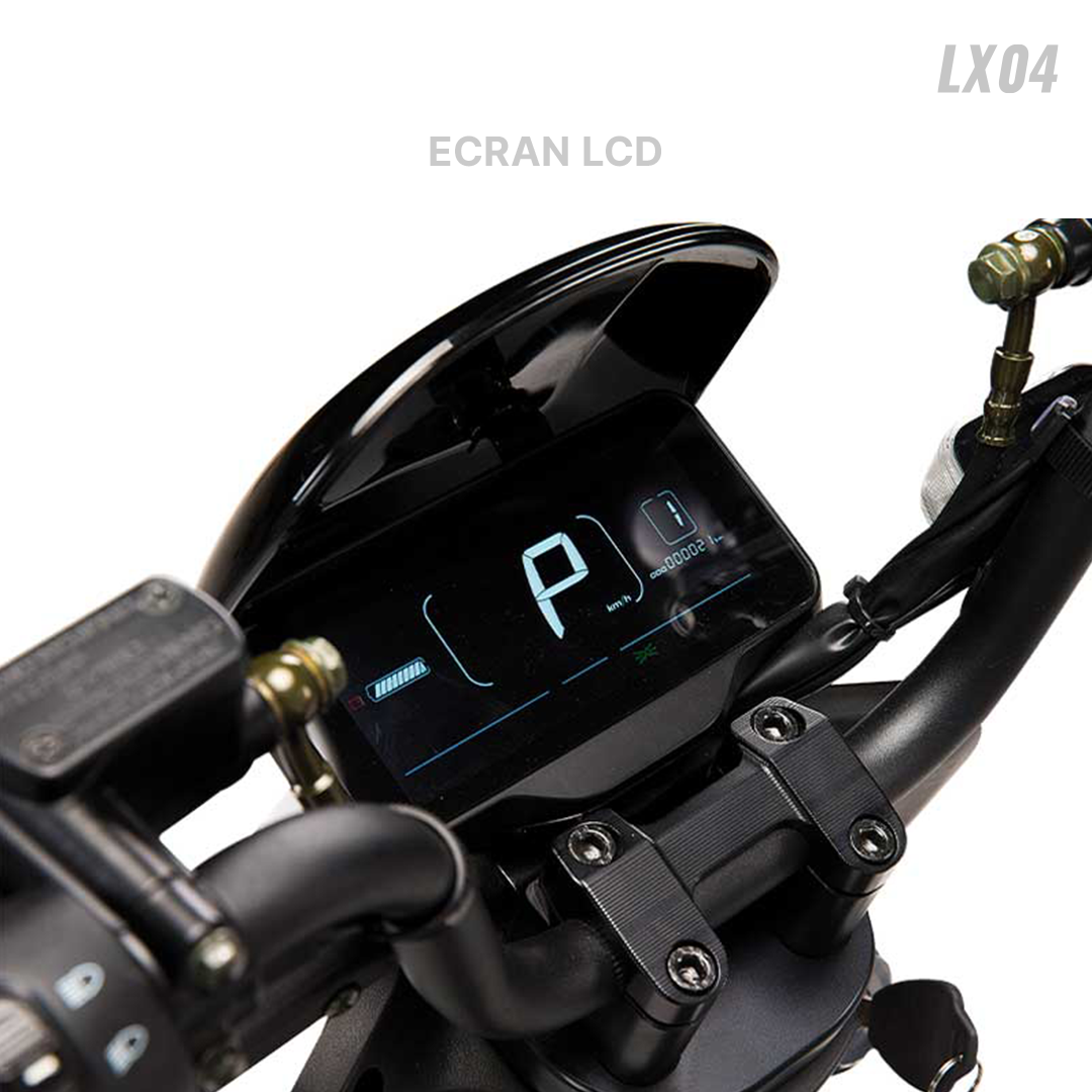 Scooter Électrique LVNENG LX04 - Type de Moteur: Bosch, Puissance de Moteur: 1440 Watts, Vitesse max: 45 km/h, Poids maximum supporté: 217 Kg, Batterie Lithium-ion 48V 26 Ah (BMS Système de management de batterie), Temps de recharge: 4 heures (de 0 à 100%), Autonomie de Batterie: Jusqu'à 50 km par batterie, Frein à disque avant & arrière, Pneus Tubeless 80/100/10, Éclairage LED, Capacité de pente: 12° (21%), Étanchéité IPX7, Alarme intégrée, Démarrage sans clé, Mode parking, Port USB, Vide poche, Repose pied rétractable, Télécommande, Sans Haut-Parleurs et Connexion Bluetooth, Dimensions: 1700 x 700 x 1050 mm, Garantie: 2 ans (sur Batterie) + 25000 Km (sur Moteur)