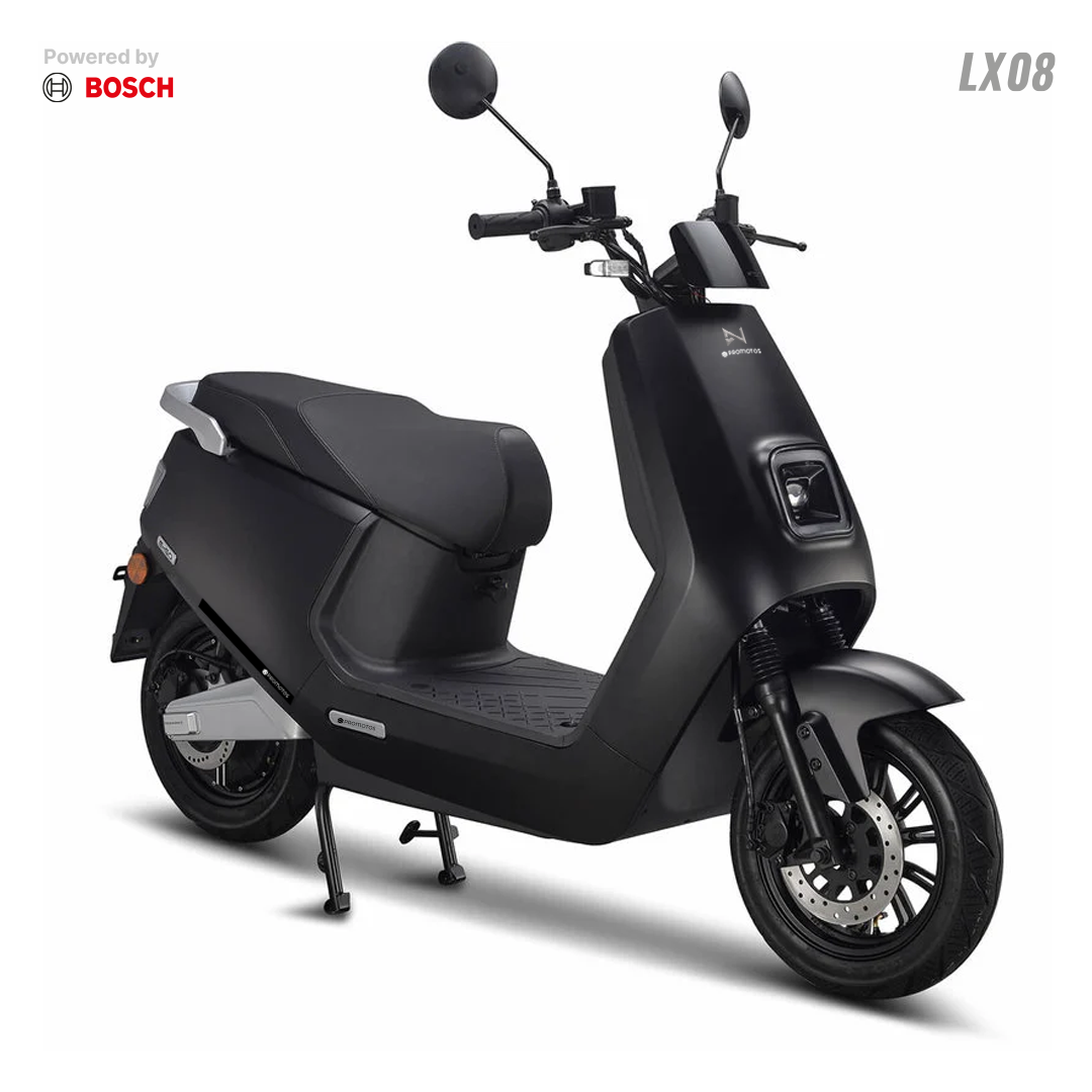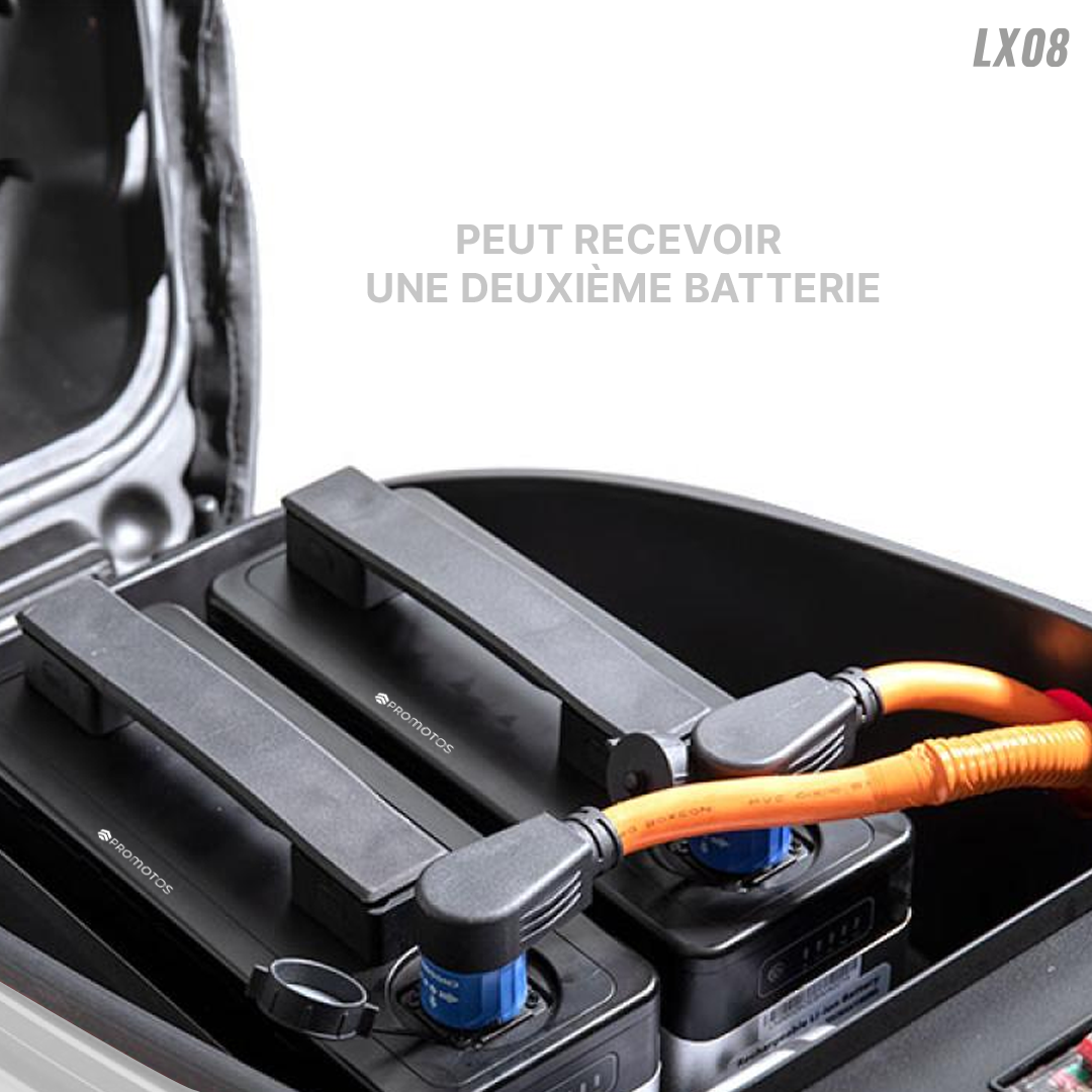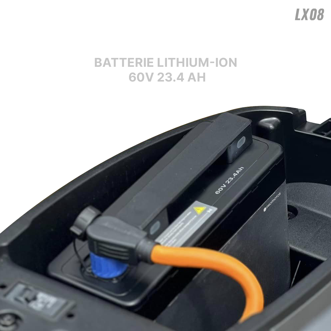 Scooter Électrique LVNENG LX08 - Type de Moteur: Bosch, Puissance de Moteur: 2030 Watts, Vitesse max: 60 km/h, Poids maximum supporté: 255 Kg, Batterie Lithium-ion 60V 23.4 Ah (BMS Système de management de batterie), Temps de recharge: 4 heures (de 0 à 100%), Autonomie de Batterie: Jusqu'à 50 km par batterie, Frein à disque avant & arrière, Pneus Tubeless 90/90/12, Éclairage LED, Capacité de pente: 15° (27%), Étanchéité IPX7, Alarme intégrée, Démarrage sans clé, Mode parking, Port USB, Vide poche, Repose pied rétractable, Télécommande, Sans Haut-Parleurs et Connexion Bluetooth, Dimensions: 1895 x 700 x 1180 mm, Garantie: 2 ans (sur Batterie) + 25000 Km (sur Moteur)