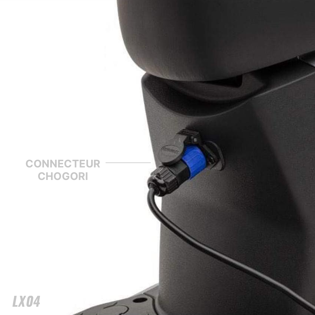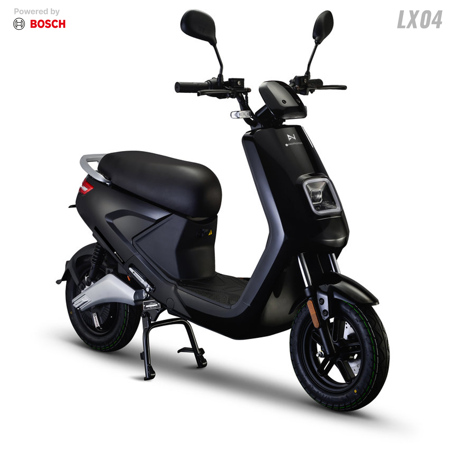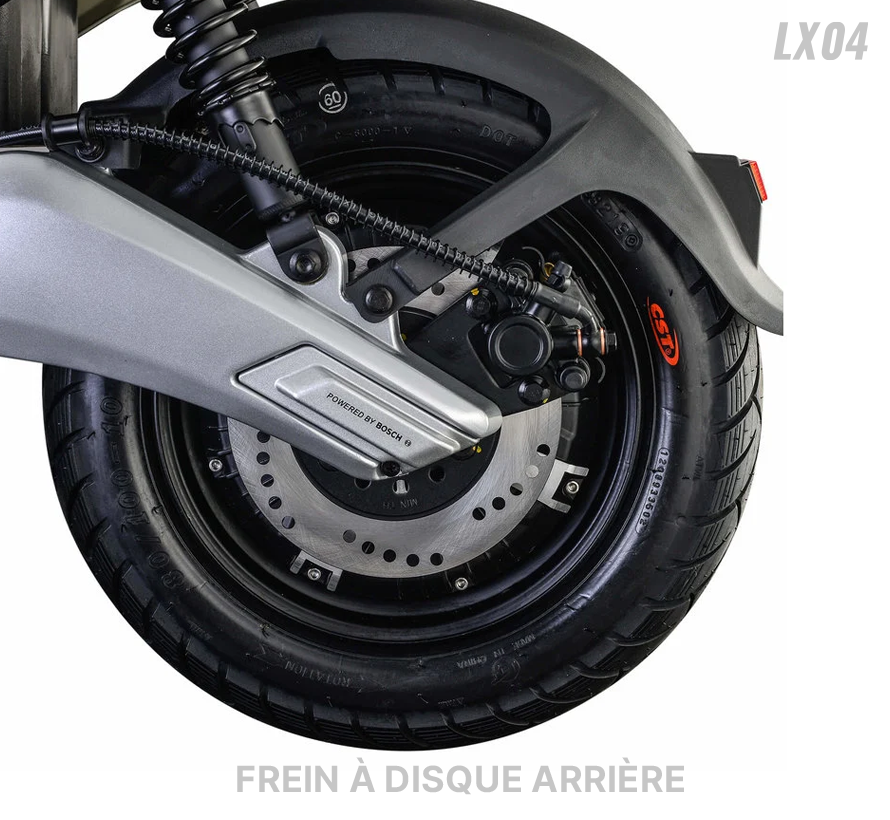 Scooter Électrique LVNENG LX04 - Type de Moteur: Bosch, Puissance de Moteur: 1440 Watts, Vitesse max: 45 km/h, Poids maximum supporté: 217 Kg, Batterie Lithium-ion 48V 26 Ah (BMS Système de management de batterie), Temps de recharge: 4 heures (de 0 à 100%), Autonomie de Batterie: Jusqu'à 50 km par batterie, Frein à disque avant & arrière, Pneus Tubeless 80/100/10, Éclairage LED, Capacité de pente: 12° (21%), Étanchéité IPX7, Alarme intégrée, Démarrage sans clé, Mode parking, Port USB, Vide poche, Repose pied rétractable, Télécommande, Sans Haut-Parleurs et Connexion Bluetooth, Dimensions: 1700 x 700 x 1050 mm, Garantie: 2 ans (sur Batterie) + 25000 Km (sur Moteur)